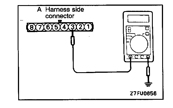 1. Disconnect the volume air flow sensor connector and connect the special tool (test harness: MB991348) in between. (All terminals should be connected.)