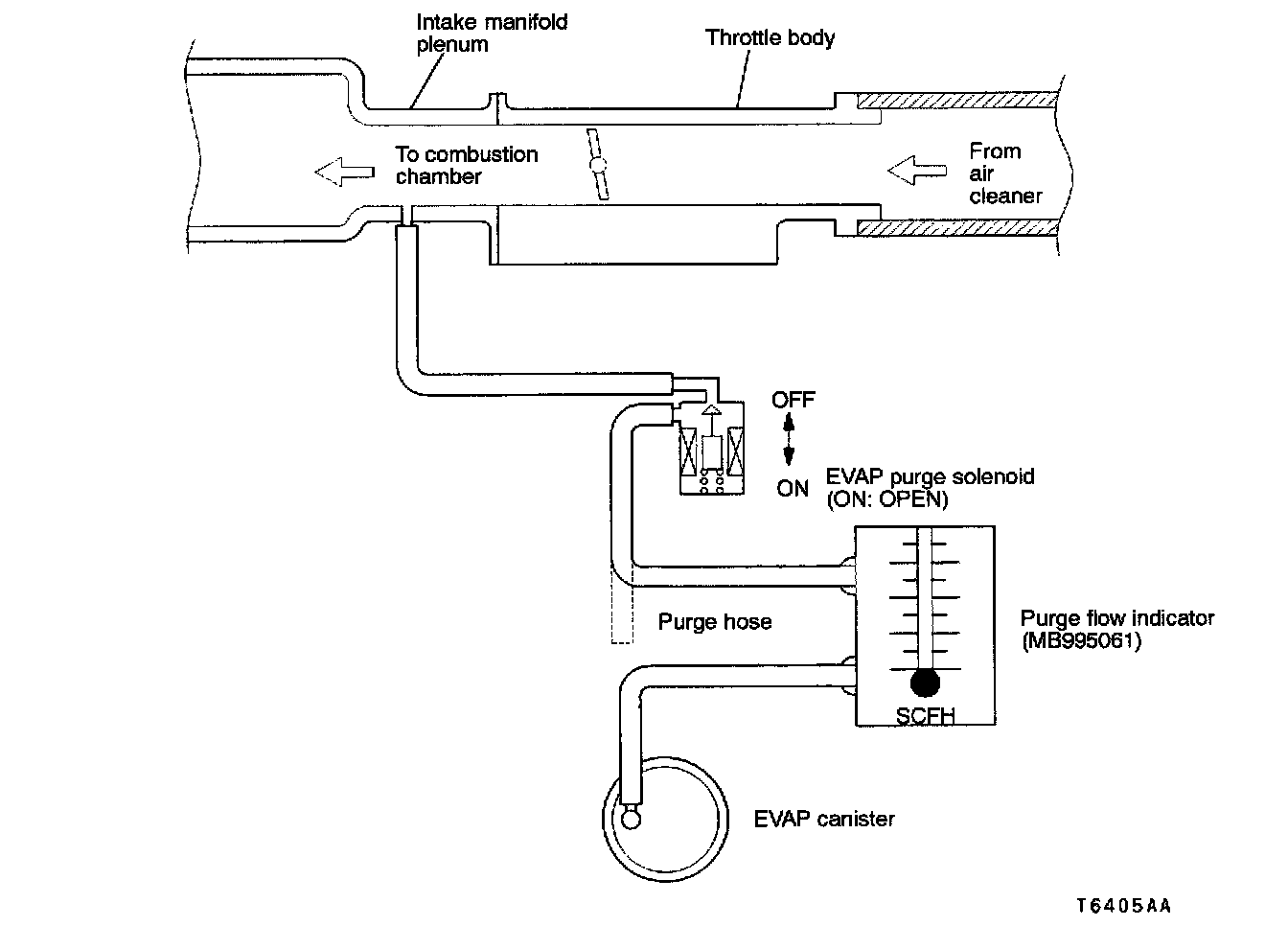 1. Disconnect the purge hose from the evaporative emission (EVAP) canister, and connect the the special tool (purge flow indicator) between the EVAP canister and the purge hose.