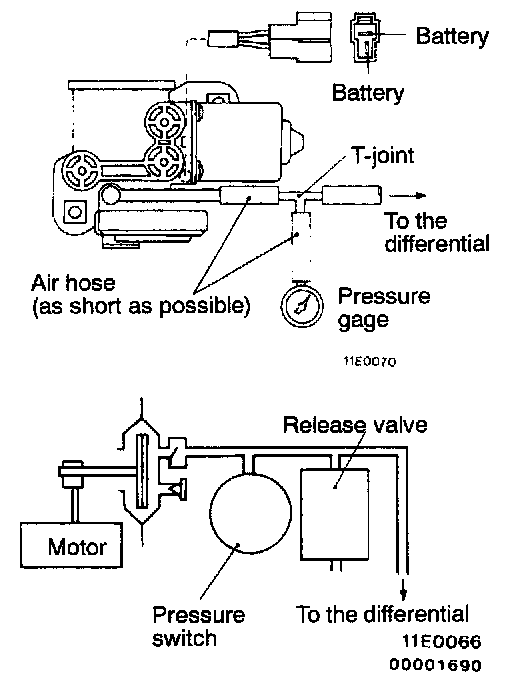 REAR DIFFERENTIAL LOCK AIR PUMP1. Connect the pressure gage to the air pump discharge outlet nozzle, via the air hose and T-joint.