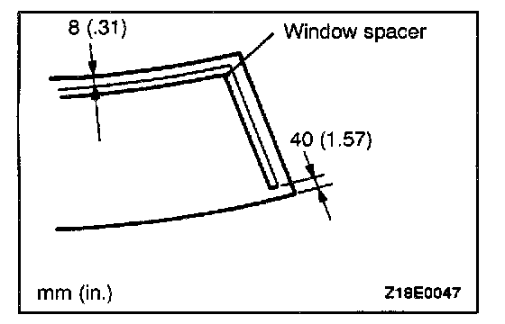 After cleaning the window spacer adhesion surface of the windshield glass with 3M AAD Part No. 8880 or equivalent to remove all grease, etc., attach the window spacer as shown in the illustration.