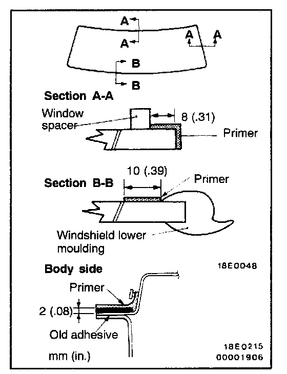9. When reusing the glass, remove the adhesive and window spacer chips still adhering to the window glass, and clean with 3M AAD Part No. 8880 or equivalent.