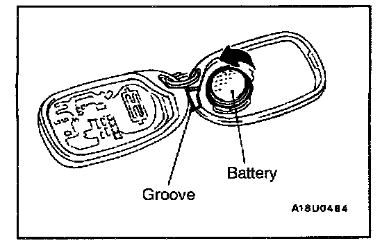 HOW TO REPLACE A BATTERY OF THE TRANSMITTER1. Insert a flat-tipped screwdriver or similar tool into the groove as shown in the illustration to open the cover, and then remove the battery from the transmitter.