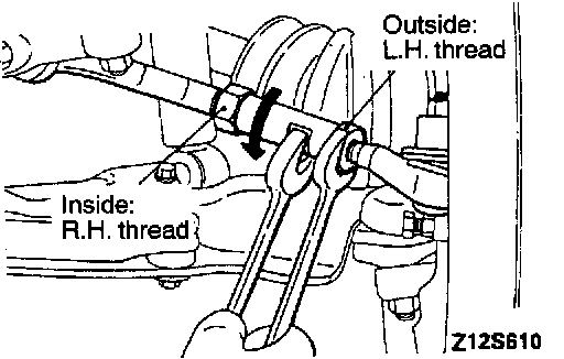 2. If the toe-in is not within the standard value, adjust the toe-in by turning the left and right tie rod turnbuckles by the same amount (in opposite directions).