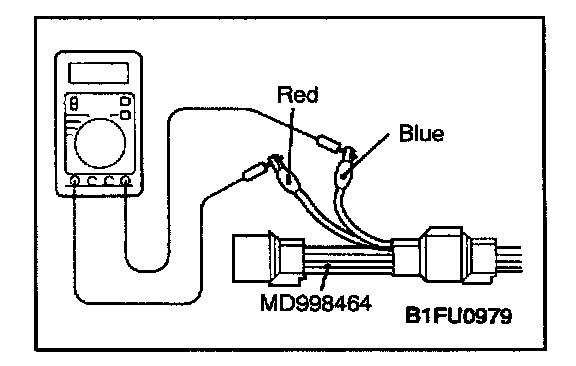 2. Check that there is continuity between terminal (1) (red clip of the special tool) and terminal (3) (blue clip) of the heated oxygen sensor connector [approx. 11 - 18 Ohms at a temperature of 20° C (68° F)].
