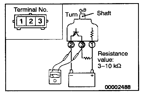 2. Turn the shaft of the vehicle speed sensor and check that there is voltage between terminal (2) and terminal (3). (1 turn = 4 pulses)