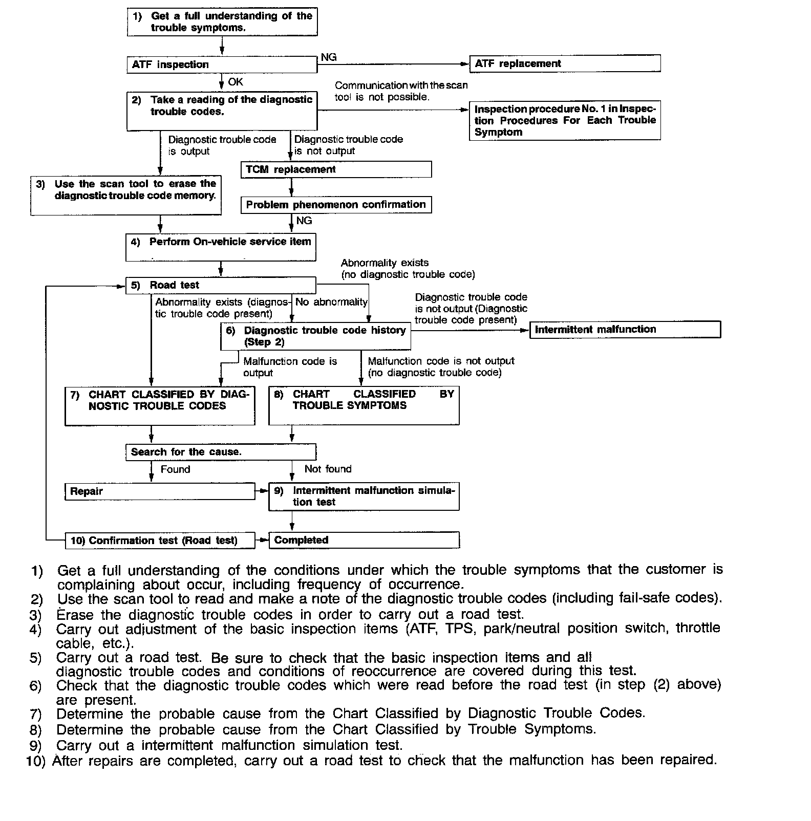 STANDARD FLOW OF DIAGNOSTIC TROUBLESHOOTINGMalfunctions of the 4 A/T system can be caused by malfunctions or incorrect adjustments of the electronic control system, hydraulic control system or A/T system or a combination of these. Carry out troubleshooting by the procedure in order to make effective diagnoses.