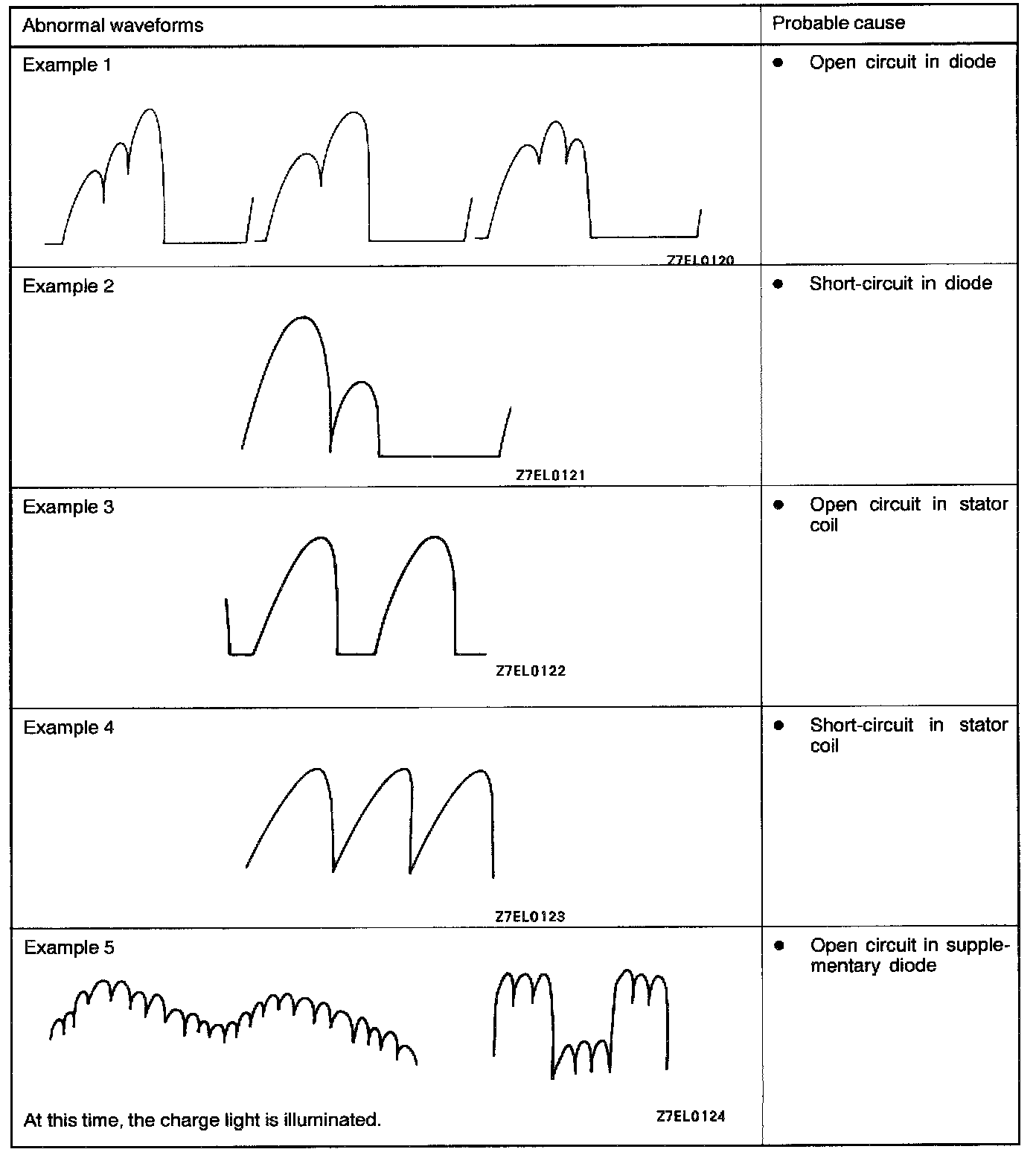 2. Identification of abnormal waveforms is easier when there is a large output current (regulator is not operating). (Waveforms can be observed when the headlights are illuminated.)