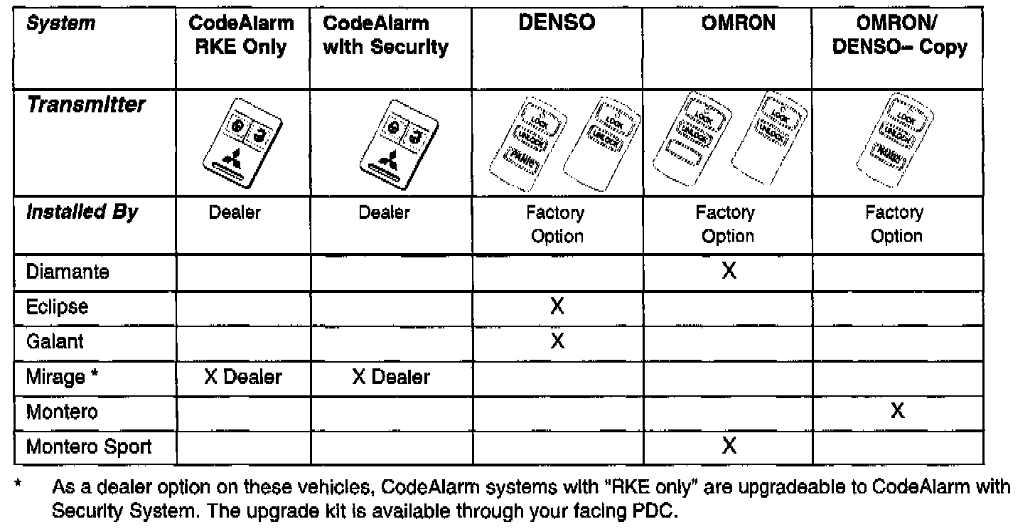 Identify the system before attempting repairs. System operation, component location, and transmitter programming are different for each system. For detailed information on troubleshooting factory-installed RKE systems, refer to Group 42 in the appropriate service manual or contact Tech Line.