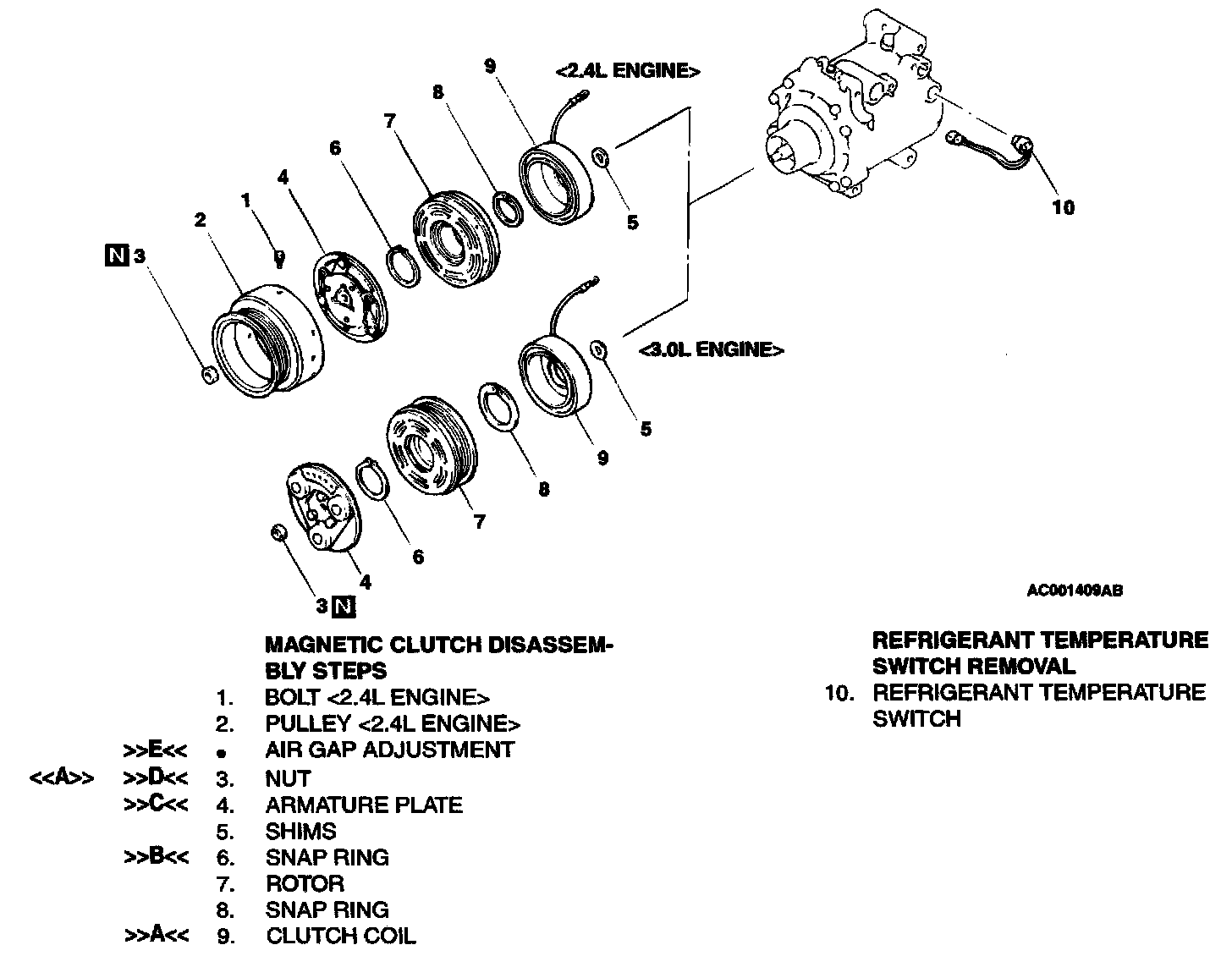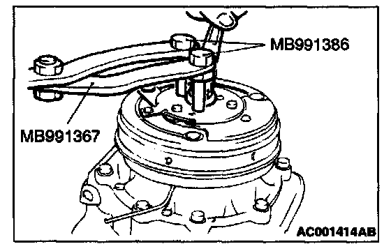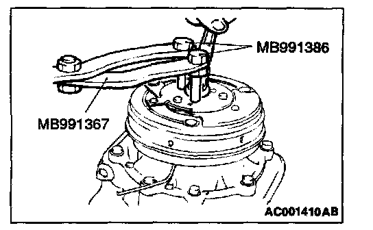 Use special tools MB991367 and MB991386 to hold the magnetic clutch, and remove the nut.