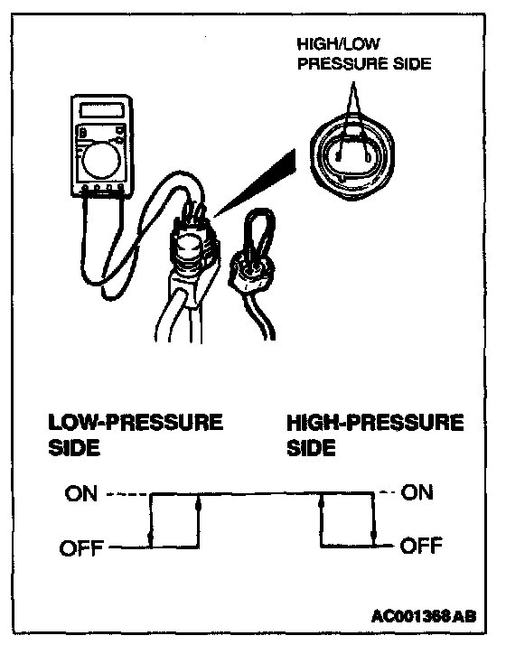3. When the high/low pressure sides of the dual pressure switch are at operation pressure (ON) and there is continuity between the respective terminals, then the condition is normal. If there is no continuity, replace the switch.