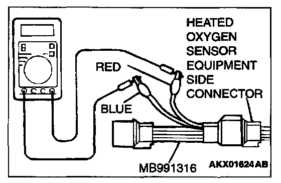 1. Disconnect the heated oxygen sensor connector and connect special tool MD998464 to the connector on the heated oxygen sensor side.
