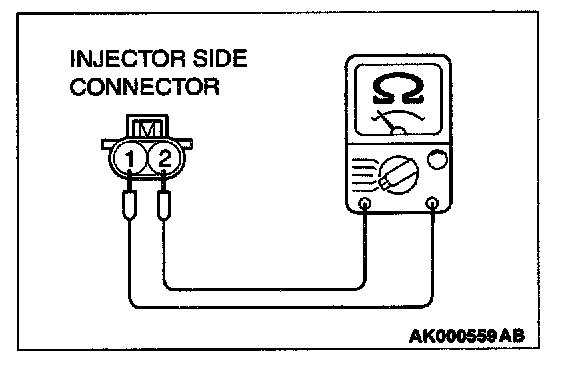 2. Measure the resistance between each injector side connector terminals 1 and 2.