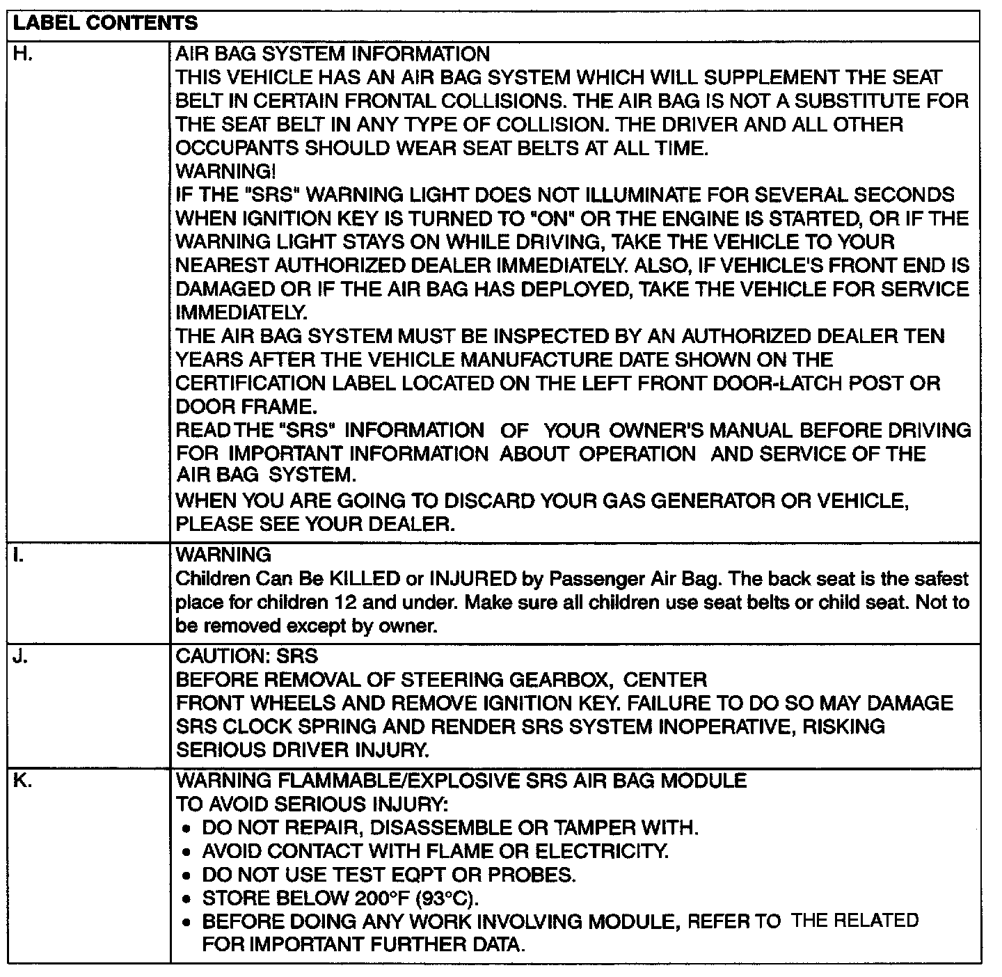A number of caution labels related to the SRS are found in the vehicle, as shown in the following illustration. Follow label instructions when servicing SRS. If labels are dirty or damaged, replace them.