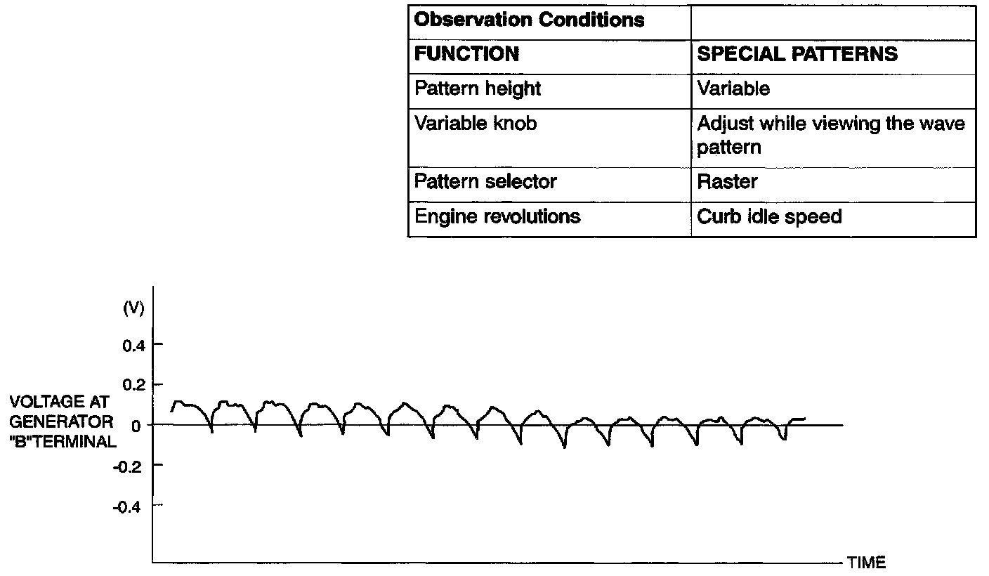 NOTE: The voltage waveform of the generator "B" terminal can undulate as shown. This waveform is produced when the regulator operates according to fluctuations in the generator load (current), and is normal far the generator. If the ripple height is abnormally high (approximately 2 V or more during idling), the wires between the generator B terminal and the battery have broken due to fuse blowing, etc. The generator is usually operating properly