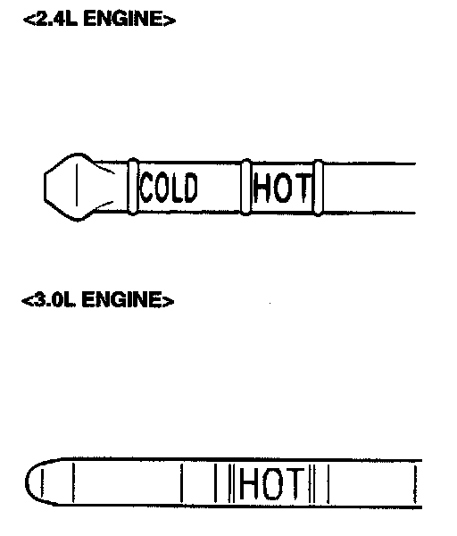 5. Check that the A/T fluid level is at the "HOT" mark on the dipstick. If the A/T fluid level is lower than this, pour in more DIAMOND ATF SP III, ATF SP II M or equivalent until the level reaches the "HOT" mark.