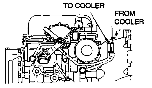 1. Disconnect the hose shown in the illustration which connects the transaxle and the oil cooler (inside the radiator). Place a container under the hose to collect the discharge.