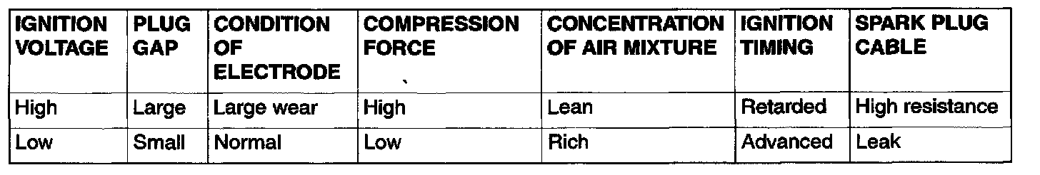 The height, length and slope of the spark line (refer to abnormal waveform examples 1, 2, 3 and 4) show the following trends.