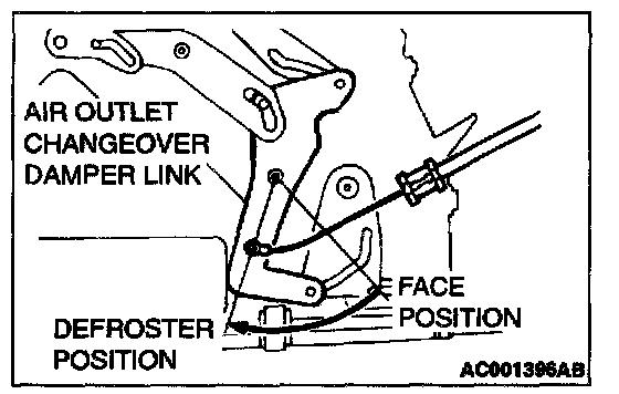 2. Set the air outlet changeover damper link of the heater/cooler unit to the defroster position as shown in the illustration, and then connect the cable to the link pin.