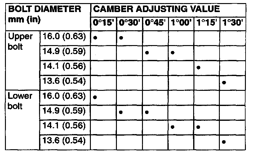 1. Estimate how much additional camber adjustment is required. Using the table below, select the camber adjusting bolt, and then replace the knuckle and strut assembly connection bolts (upper bolt, lower bolt) with the selected bolts.