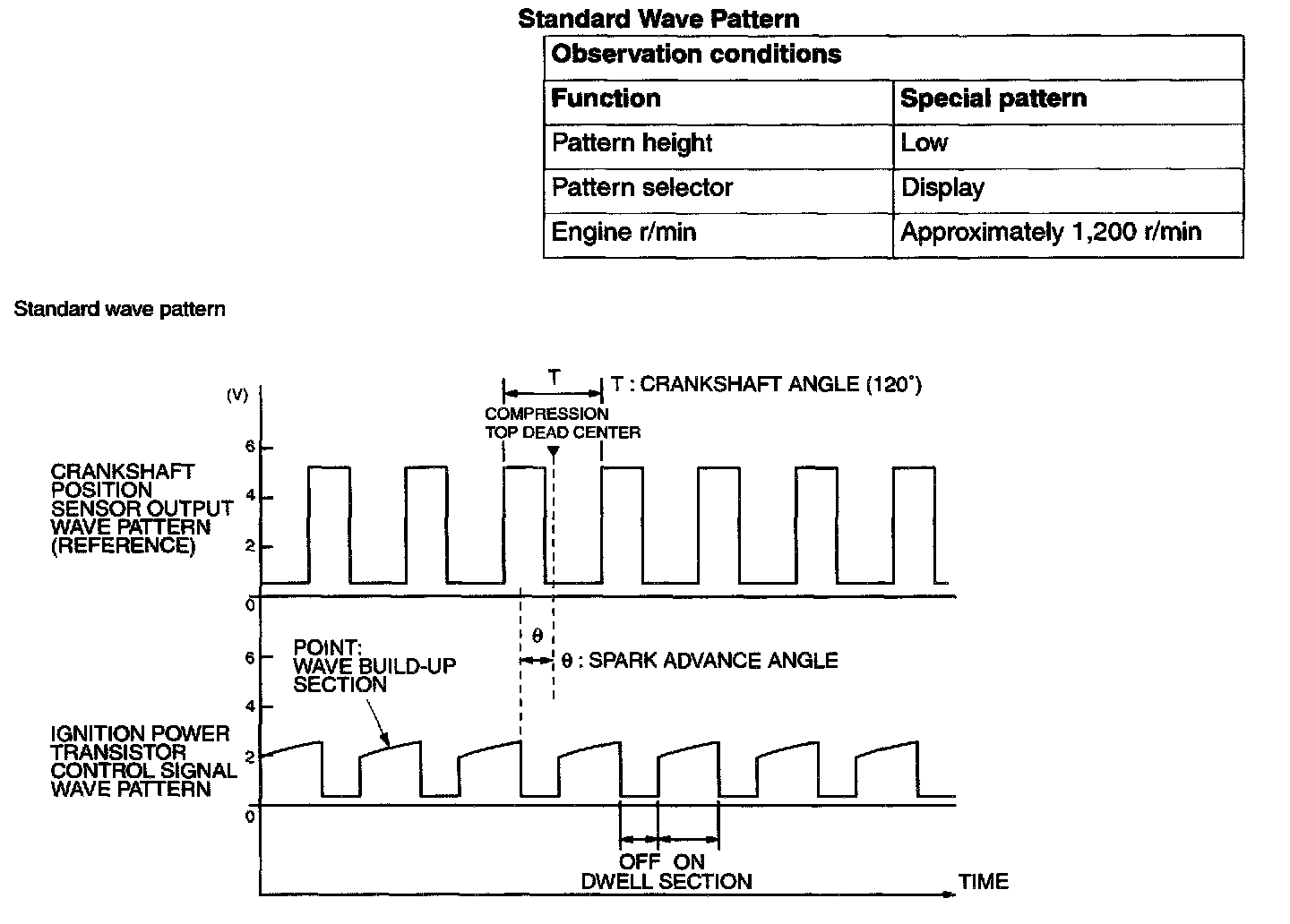 Point: Condition of wave pattern build-up section and maximum voltage (Refer to abnormal wave pattern examples 1 and 2).