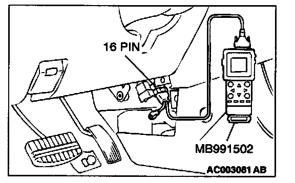 CAUTION: To prevent damage to scan tool MB991502, always turn the ignition switch to the "LOCK" (OFF) position before connecting or disconnecting scan tool MB991502.