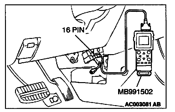CAUTION: To prevent damage to scan tool MB991502, always turn the ignition switch to the "LOCK" (OFF) position before connecting or disconnecting scan tool MB991502.