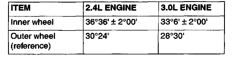 For each one turn of the left and right tie rods, the toe-in will be adjusted by approximately 1° 05' (per wheel). Use a turning radius gauge to check that the steering angle is at the standard value.