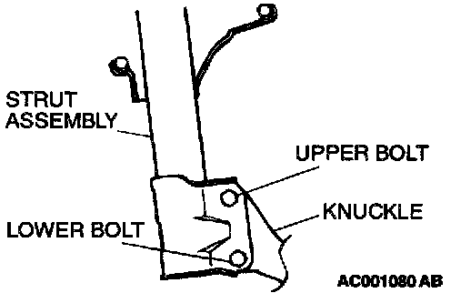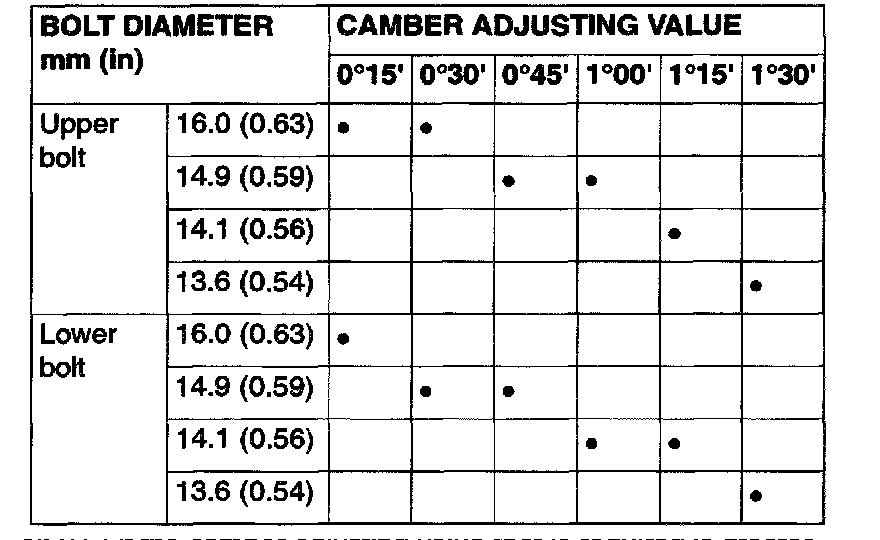 1. Estimate how much additional camber adjustment is required. Using the table below, select the camber adjusting bolt, and then replace the knuckle and strut assembly connection bolts (upper bolt, lower bolt) with the selected.