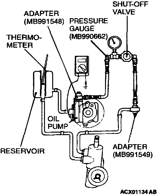 1. Disconnect the pressure hose from the oil pump, and then connect special tools MB991548, MB990662 and MB991549.