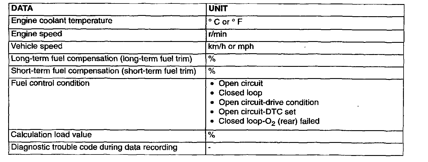 NOTE: If the sensor connector is disconnected with the ignition switch turned on, the diagnostic trouble code is memorized In this case, send the diagnostic trouble code erase signal to the PCM in order to erase the diagnostic memory The 59 diagnostic items are all indicated sequentially from the smallest code number. The PCM records the engine operating condition when the diagnostic trouble code is set. This data is called "Freeze-frame" date. This data can be read by using the scan tool, and can then be used in simulation tests for troubleshooting. Data items are as follows: