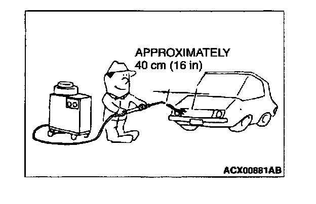 If high-pressure car-washing equipment or steam car-washing equipment is used to wash the vehicle, be sure to maintain the spray nozzle at a distance of at least approximately 40 cm (16 inches) from any plastic parts and all opening parts (doors, luggage compartment, etc.).