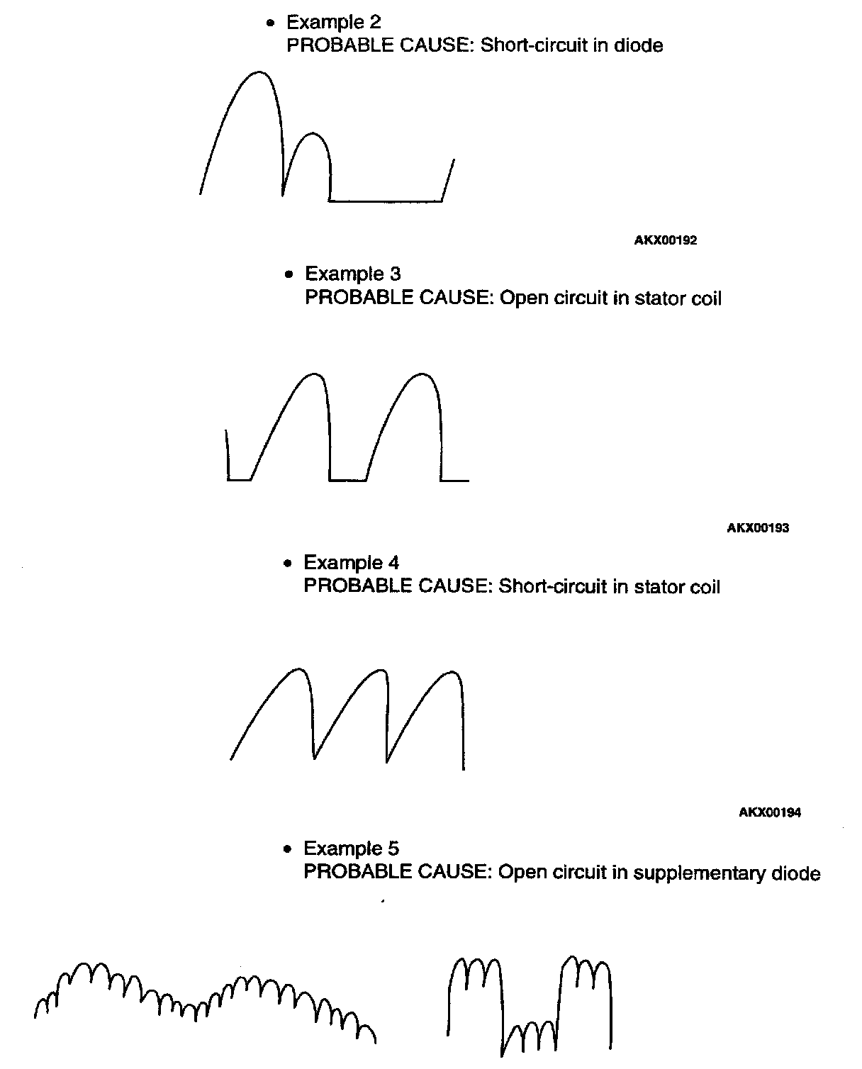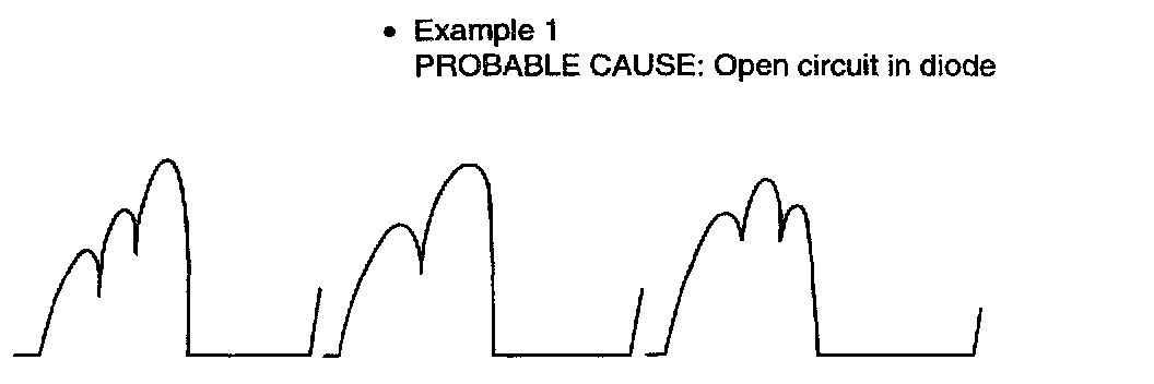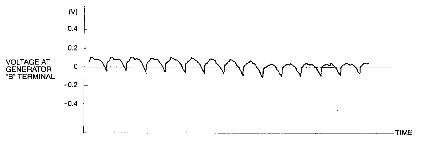 NOTE: Identification of abnormal waveforms is easier when there is a large output current (regulator is not operating). (Waveforms can be observed when the headlights are illuminated.)