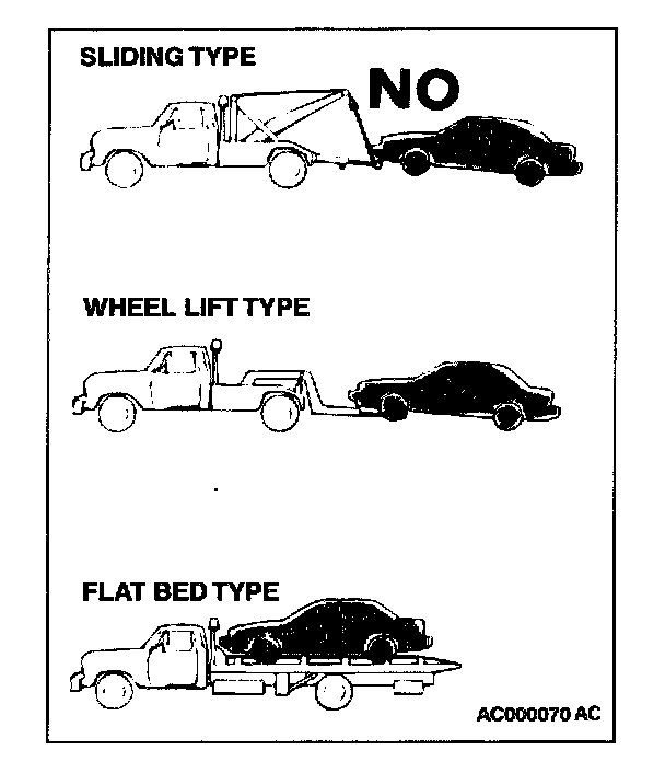 CAUTION: This vehicle cannot be towed by a wrecker using sling- type equipment otherwise the bumper may become deformed. If this vehicle is towed, use wheel lift or flat bed equipment.
