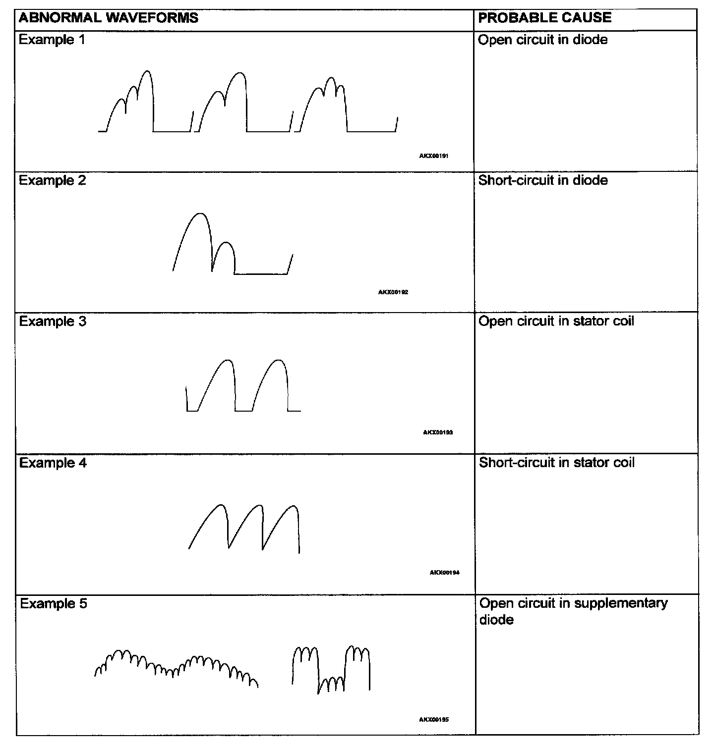 NOTE: Identification of abnormal waveforms is easier when there is a large output current (regulator is not operating). (Waveforms can be observed when the headlights are illuminated.)