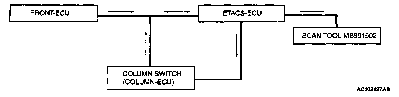 As shown signal wires used exclusively for transmitting multiplex signal data connect the ETACS-ECU, front-ECU, column switch (incorporating the column-ECU) and these components communicate with each other.