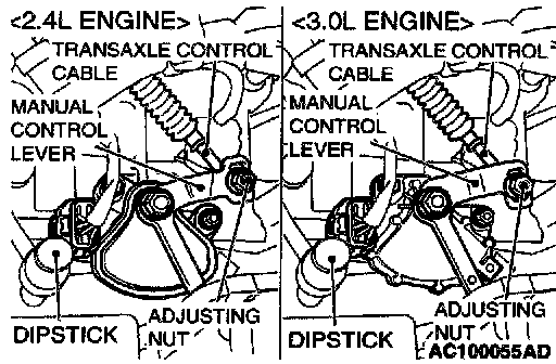 6. Gently push the transaxle control cable in the direction of the arrow, until the cable is taut. Tighten the adjusting nut.