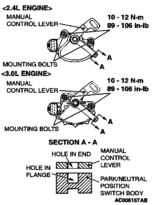 4. Loosen the park/neutral position switch body mounting bolts and turn the park/neutral position switch body so the hole in the end of the manual control lever and the hole (section A -A in the figure on the left) in the flange of the park/neutral position switch body flange are aligned.