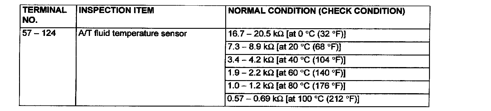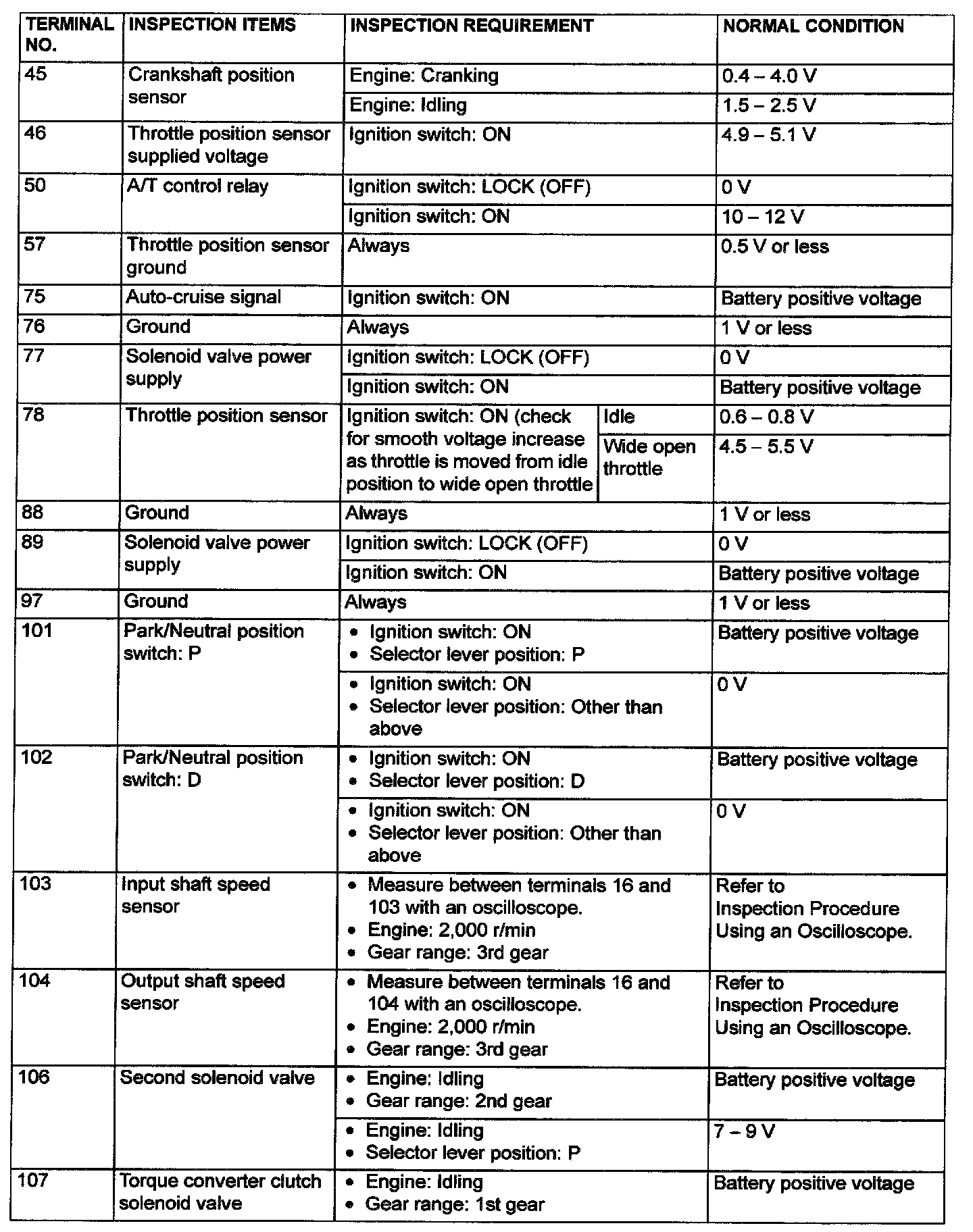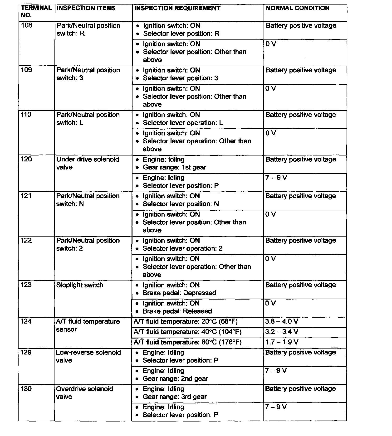 PCM TERMINAL VOLTAGE REFERENCE CHART FOR TRANSAXLE OPERATION