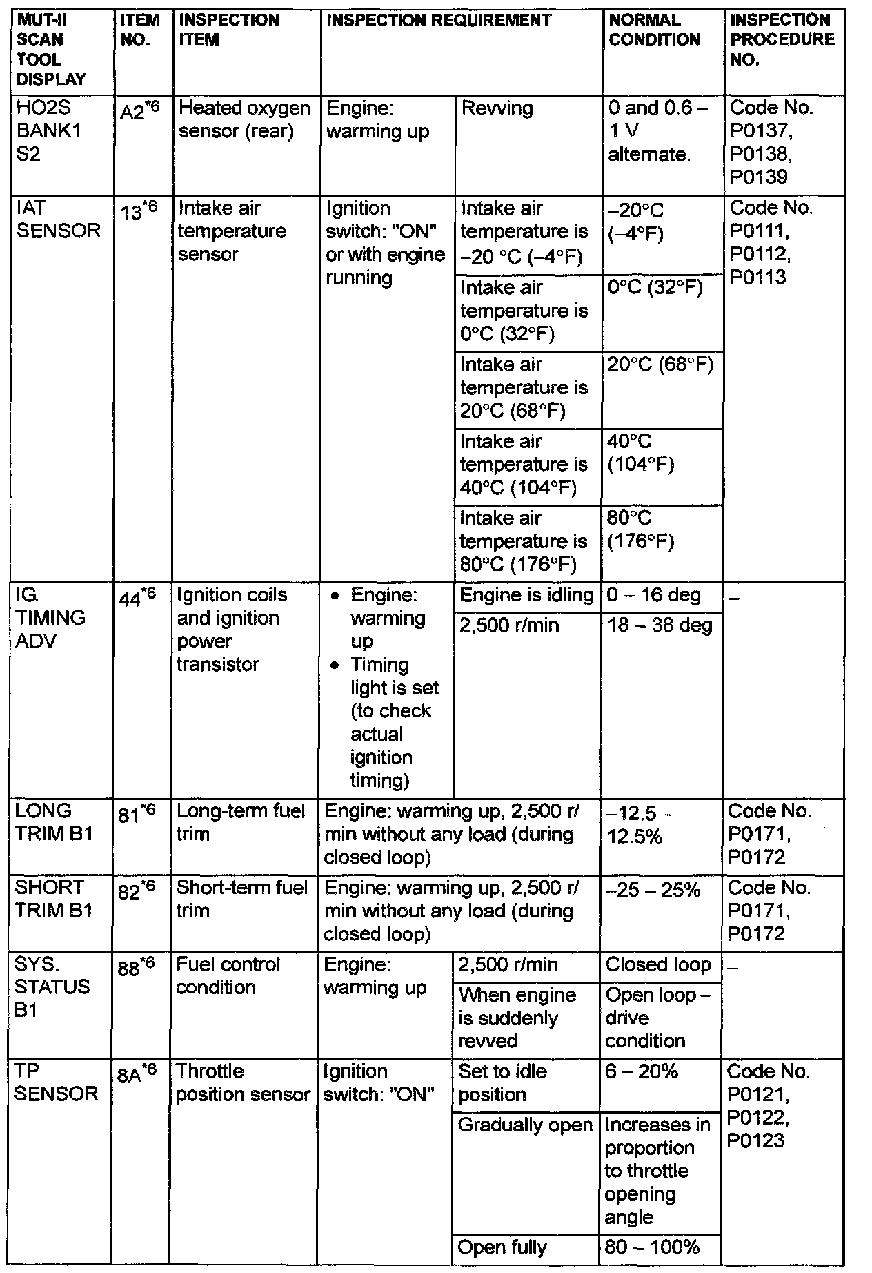 NOTE: *6: GST items. [Data list items consist of MUT-II items and GST items. GST items can be accessed through the use of a general scan tool (GST). When MUT-II (MB991502) is used, MUT-II items appear alphabetically; then, GST items appear alphabetically The black and white characters of the GST items are inverted from the MUT-II items]