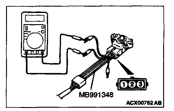 5. Disconnect the fuel tank differential pressure sensor connector and connect special tool MB991348 between the terminals of the disconnected connector