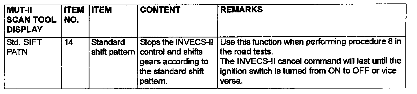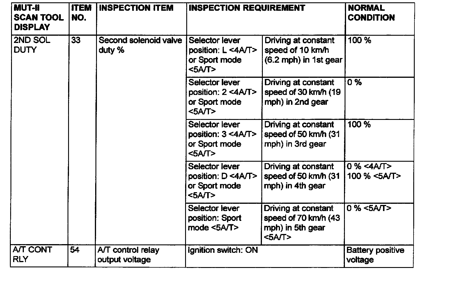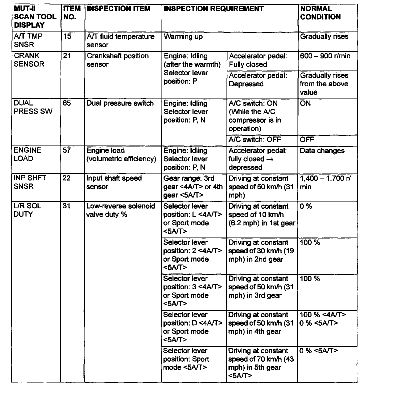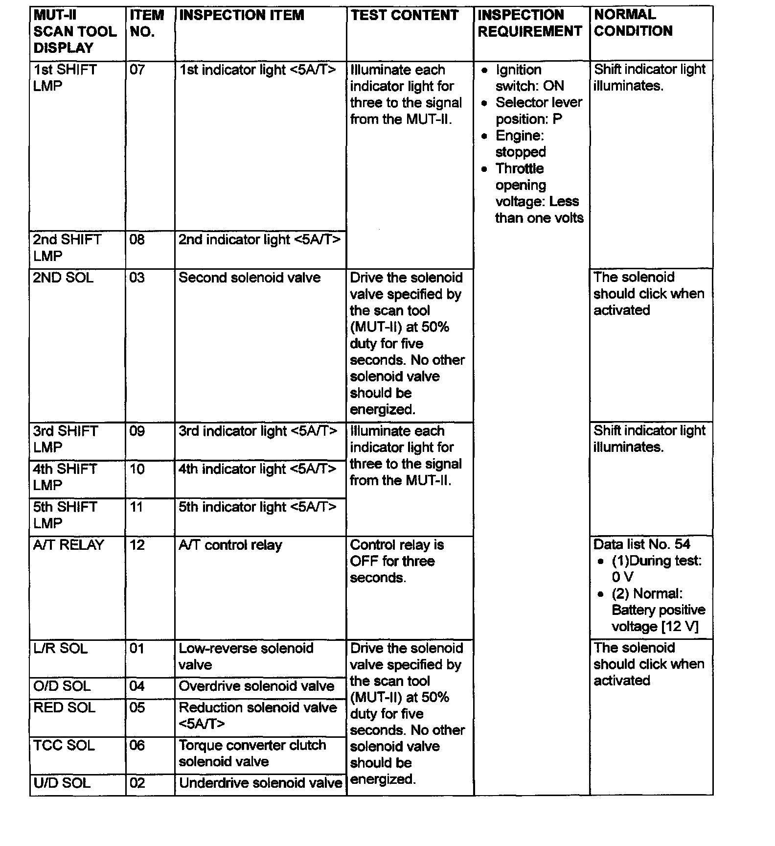 Data List and Actuator Test Reference Table