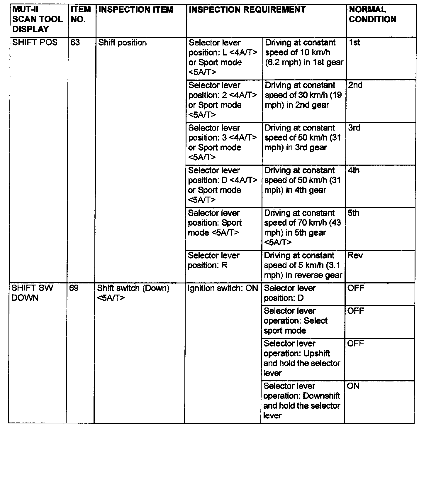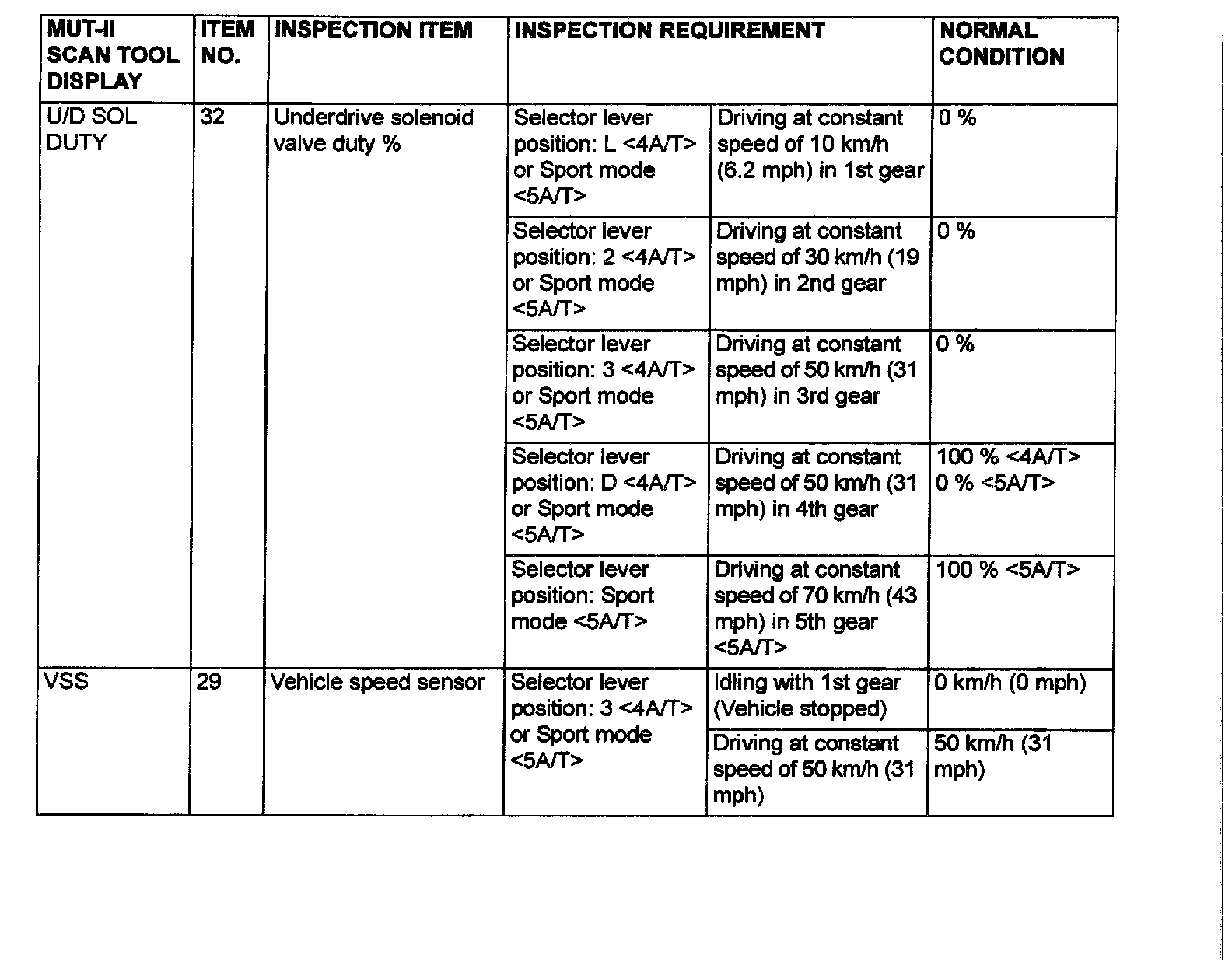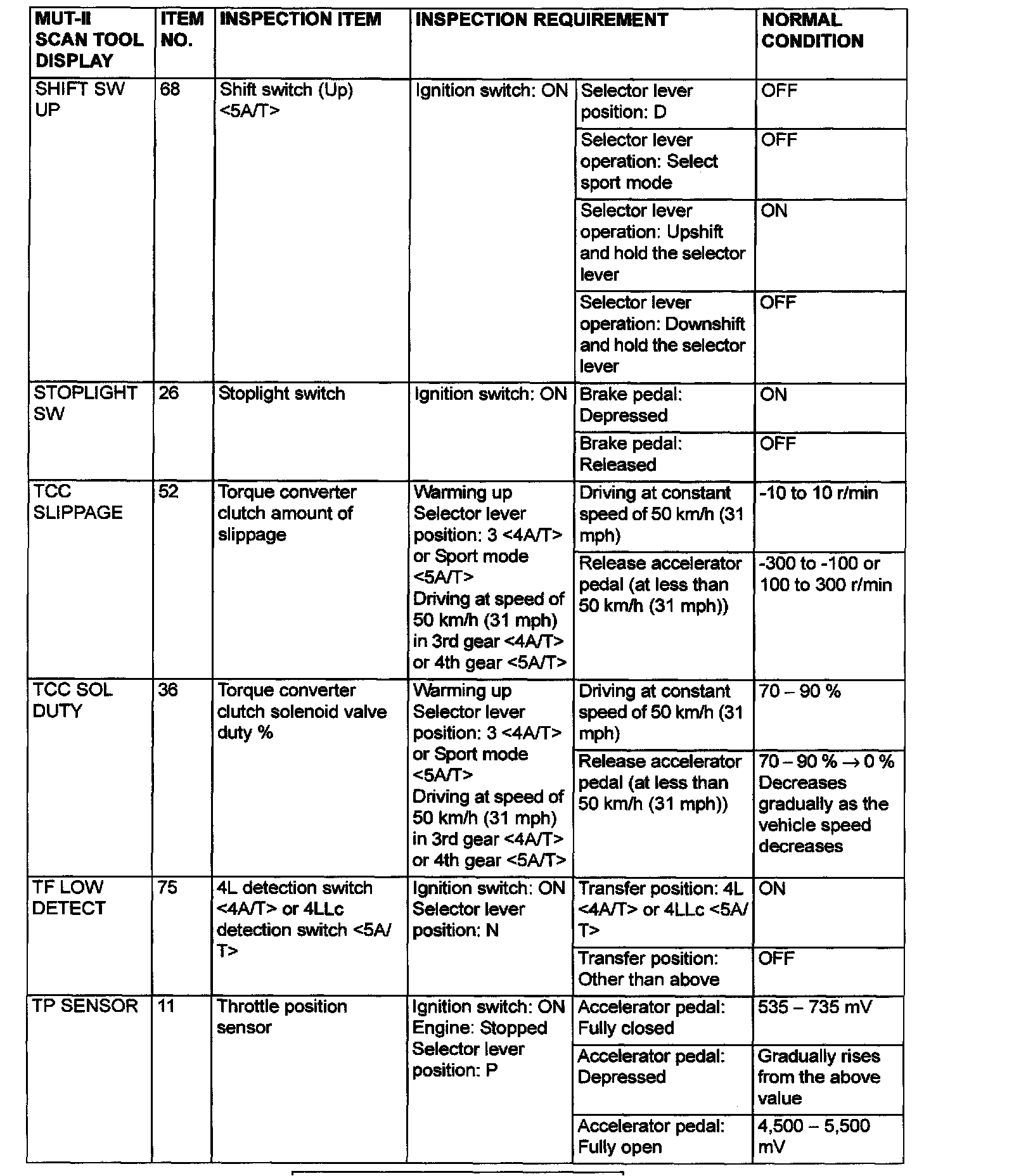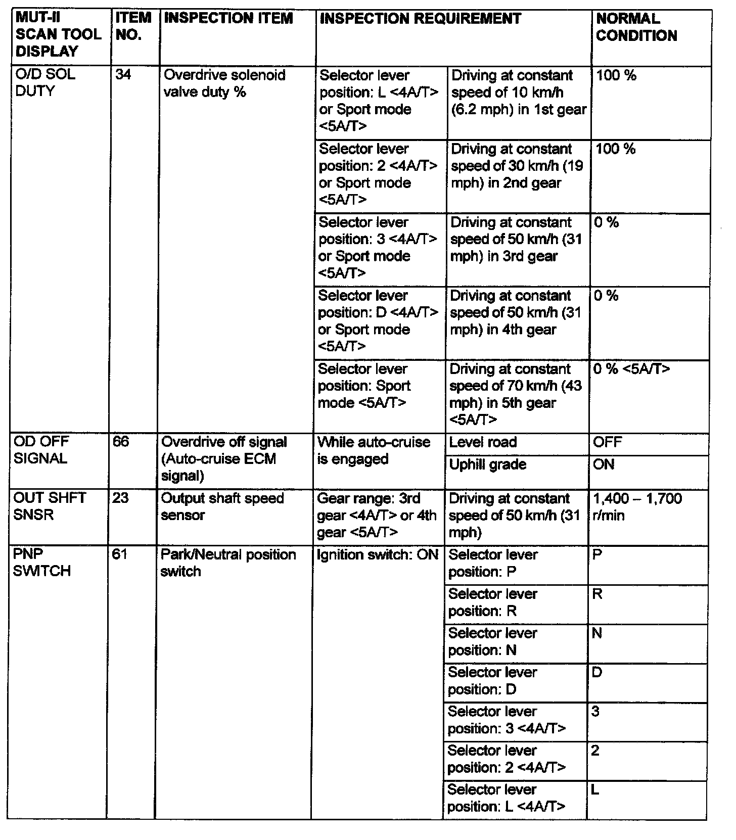 Data List and Actuator Test Reference Table