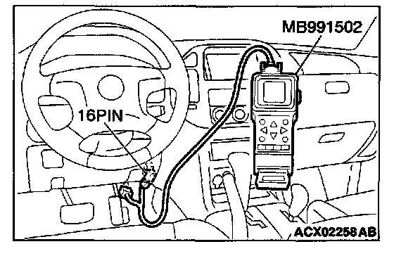CAUTION: To prevent damage to scan tool MB991502, always turn the ignition switch to the "LOCK" (OFF) position before connecting or disconnecting scan tool MB991502.
