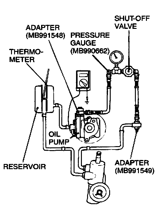 1. Disconnect the pressure hose from the oil pump, and then connect special tools MB991548, MB990662 and MB991549.