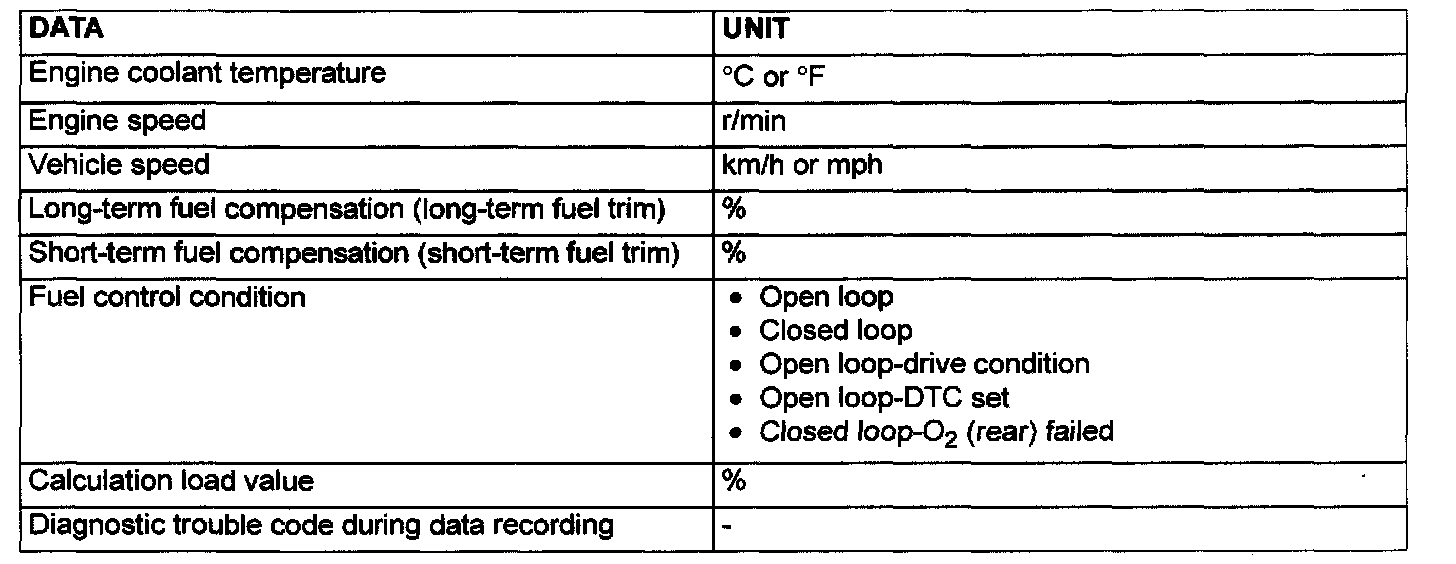 NOTE: If the sensor connector is disconnected with the ignition switch turned on, the diagnostic trouble code is memorized. In this case, send the diagnostic trouble code erase signal to the PCM in order to erase the diagnostic memory. The 65 diagnostic items are all indicated sequentially from the smallest code number The PCM records the engine operating condition when the diagnostic trouble code is set. This data is called "Freeze-frame" date. This data can be read by using the scan tool and can then be used in simulation tests for troubleshooting. Data items are as follows: