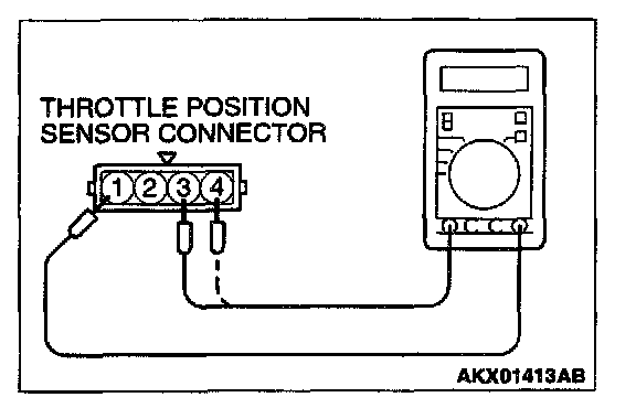 1. Disconnect the throttle position sensor connector and connect the test harness special tool (MB991348) in between.(All terminals should be connected.)