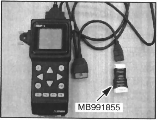 On 2002 models, adapter tool MB991855 must be connected to the MUT-II scan tool as shown.