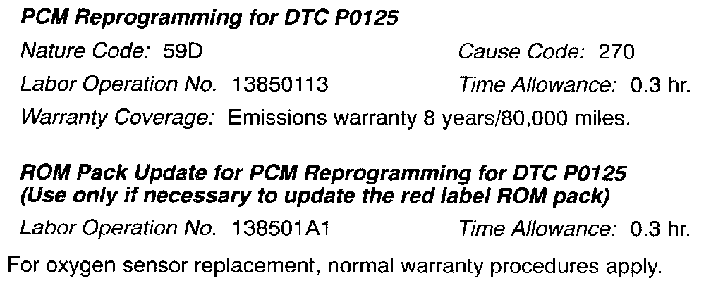 Incorrect PCM software parameters may cause the MIL ("SERVICE ENGINE SOON") light to come on and Diagnostic Trouble Code P0125 to set. This typically occurs with no driveability concerns. To eliminate this condition, reprogram the PCM as described in this bulletin.