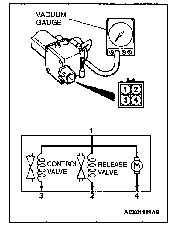 1. Connect the positive battery terminal to auto-cruise vacuum pump connector terminal 1, and the negative battery terminal to terminals 2, 3, and 4.