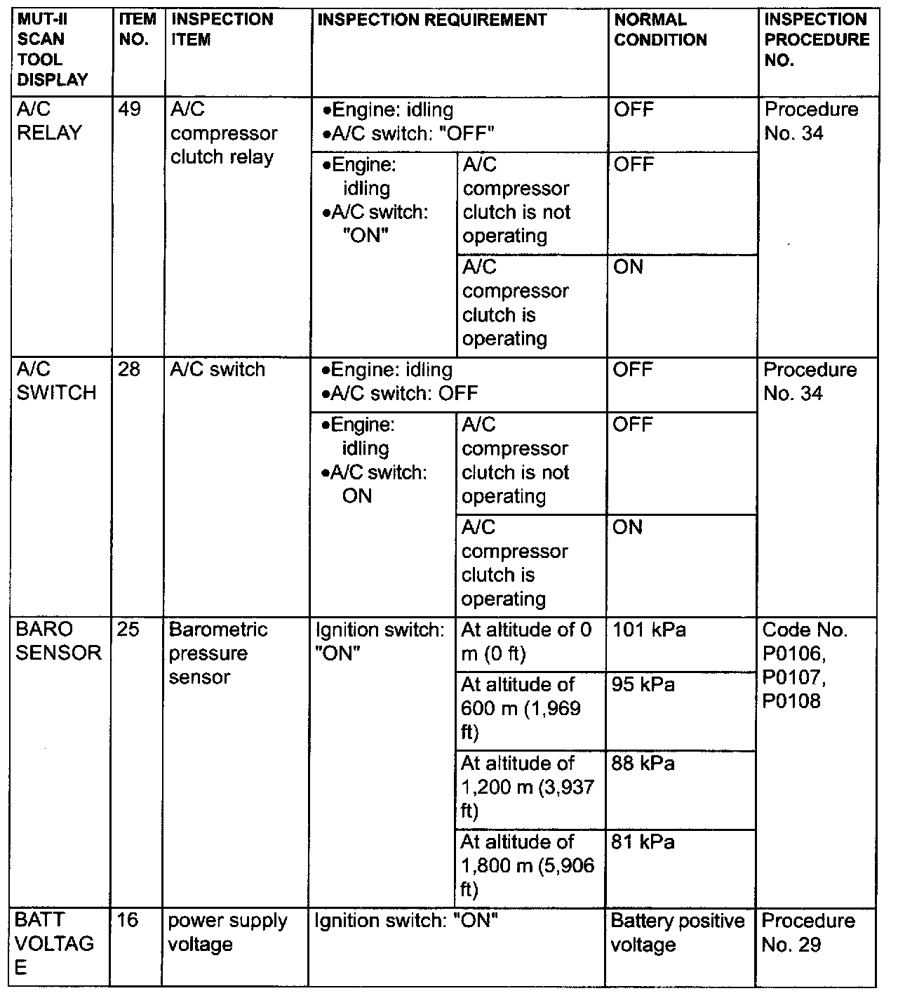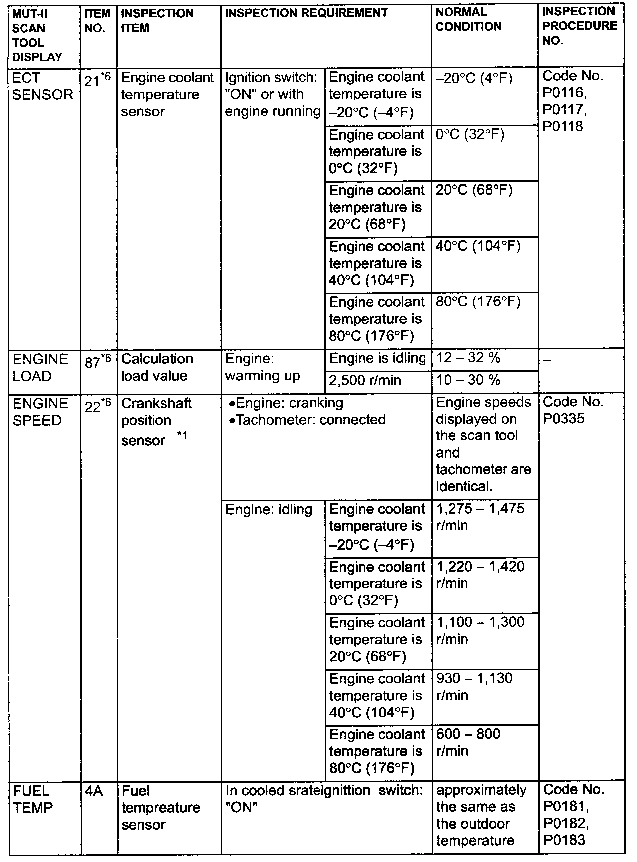 *6: GST items. [Data list items consist of MUT-II items and GST items. GST items can be accessed through the use of a general scan tool (GST). When MUT-II (MB991502) is used, MUT-II items appear alphabetically; then, GST items appear alphabetically. The black and white characters of the GST items are inverted from the MUT-II items.]